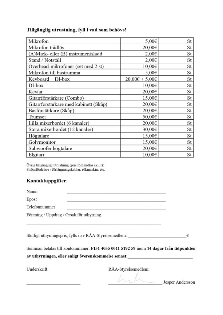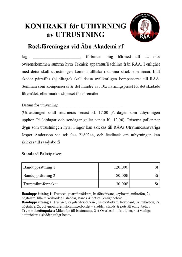RÅA erbjuder uthyrning av musikutrustning för privatpersoner eller föreningar vid Åbo Akademi för förmånliga priser.